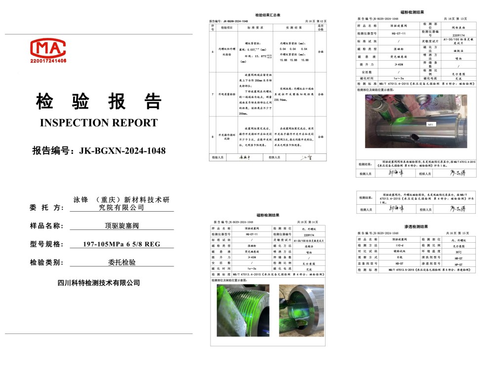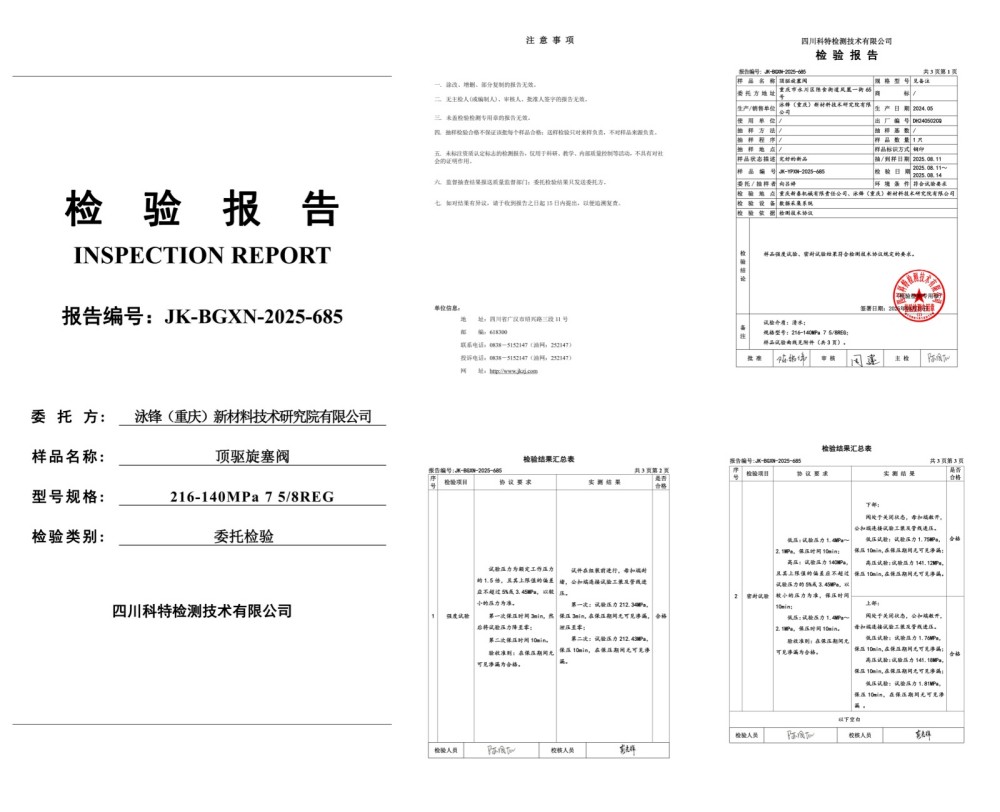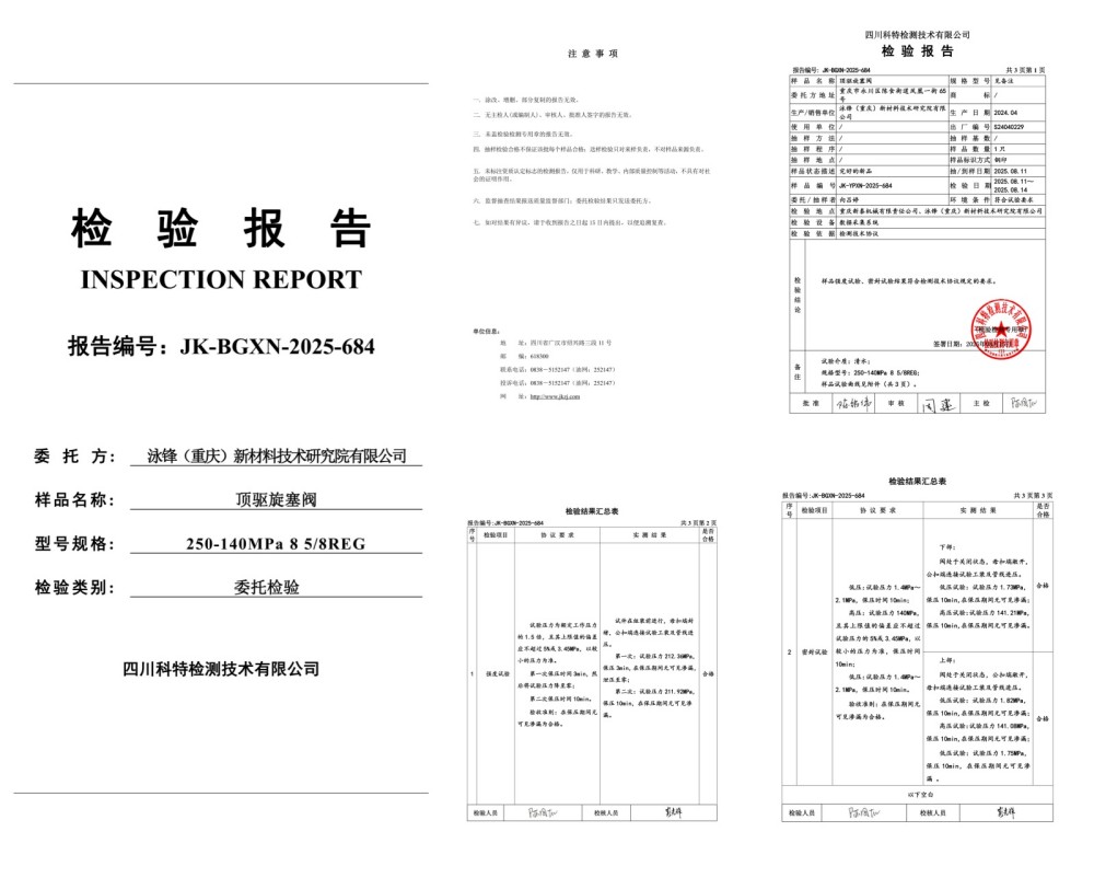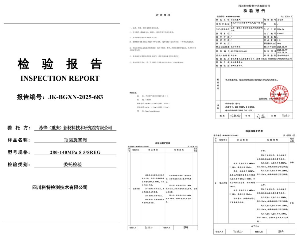 140MPa特高压特深井顶驱旋塞阀,DQ70顶驱用IBOP197/140MPa、12000米钻机用IBOP250/140MPa、15000米钻机用IBOP280/140MPa;已通过第三方国家级测试机构认证,并交于客户使用。实际应用案例:国家级深地塔科1井、川科1井,并取得重大成功。
